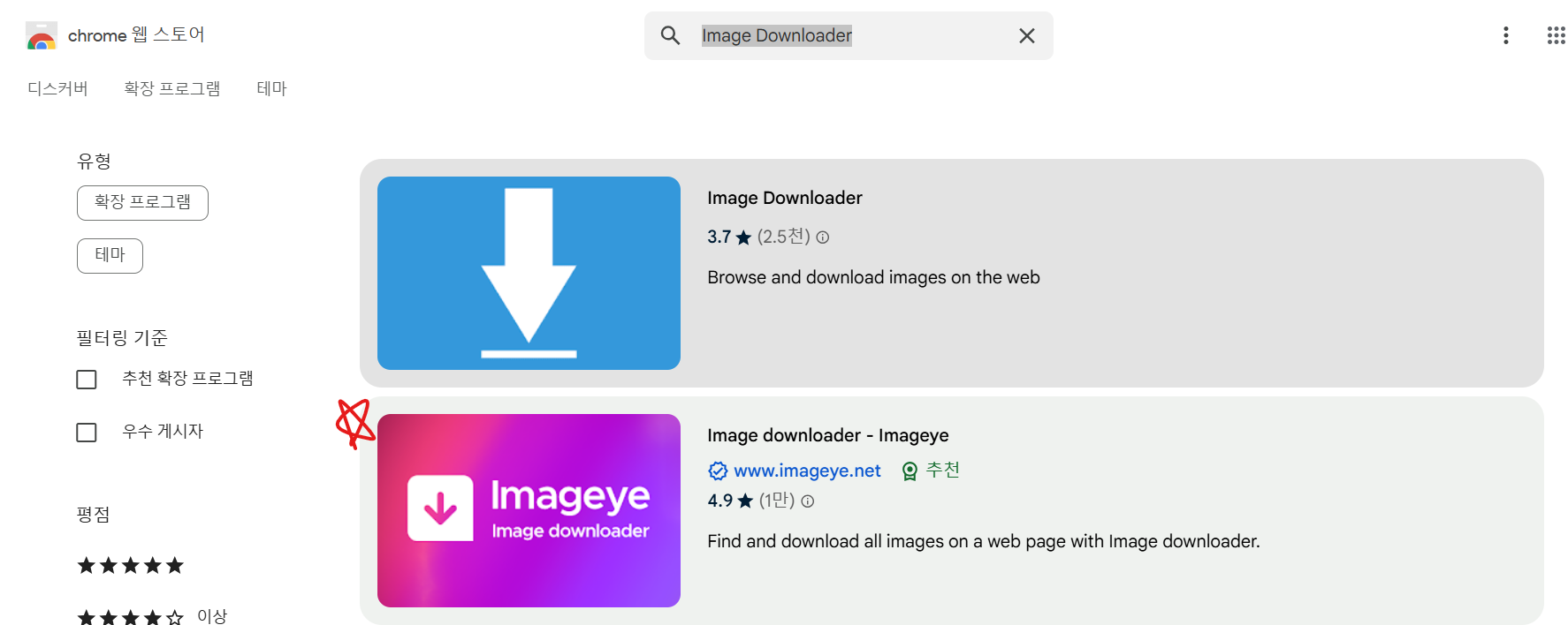 • 크롬 웹 스토어 페이지 오른쪽 상단의 검색창에 Image Downloader를 입력한 후 Enter를 누릅니다.