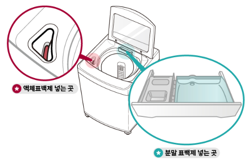 - 액체 전용 칸에만 넣으세요. 분말 표백제는 절대 넣지 마세요.