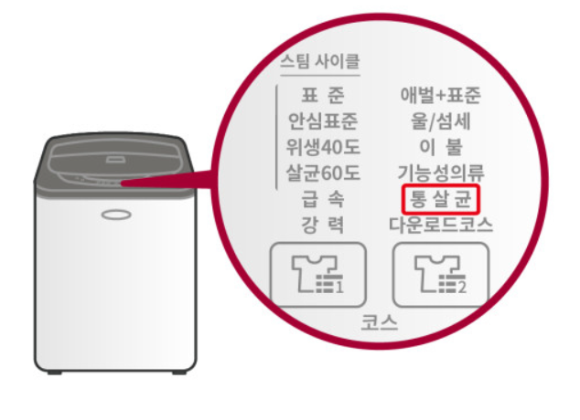 - 전원 버튼을 눌러 세탁기를 켜고 코스 버튼을 통해 통세척 또는 통살균 코스를 선택하세요.