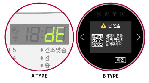 - dE (door open error): 문이 열려있거나 도어 센서를 인식하지 못한 상태로, 안전을 위해 작동이 중지됩니다.
